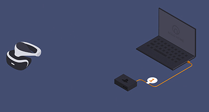 将L字型卡座针贴在PSVR的上沿、中间,头盔定位器沿卡座插入以固定,并用4米线连接头盔定位器与电脑。